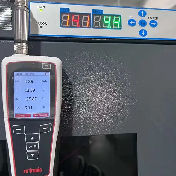 Antes de sair das fábricas, cada câmara de teste e gabinete seco passam por um teste de envelhecimento contínuo com duração >48 horas. Cada gabinete seco é acompanhado por um certificado de calibração, medido por higrômetros Rotronic de alta precisão, e cada câmara de teste é acompanhada por um certificado de calibração de 9 pontos, medido por laboratório certificado ISO17025 - rastreável aos padrões nacionais - garantindo que o equipamento que você recebe oferece desempenho preciso e "plug-and-play".