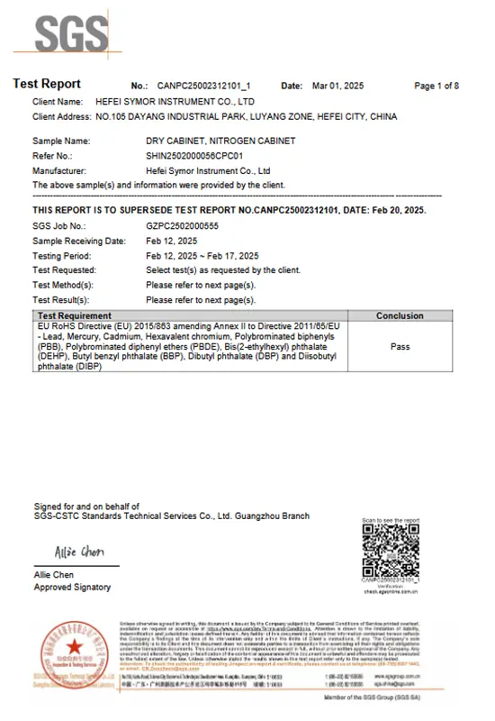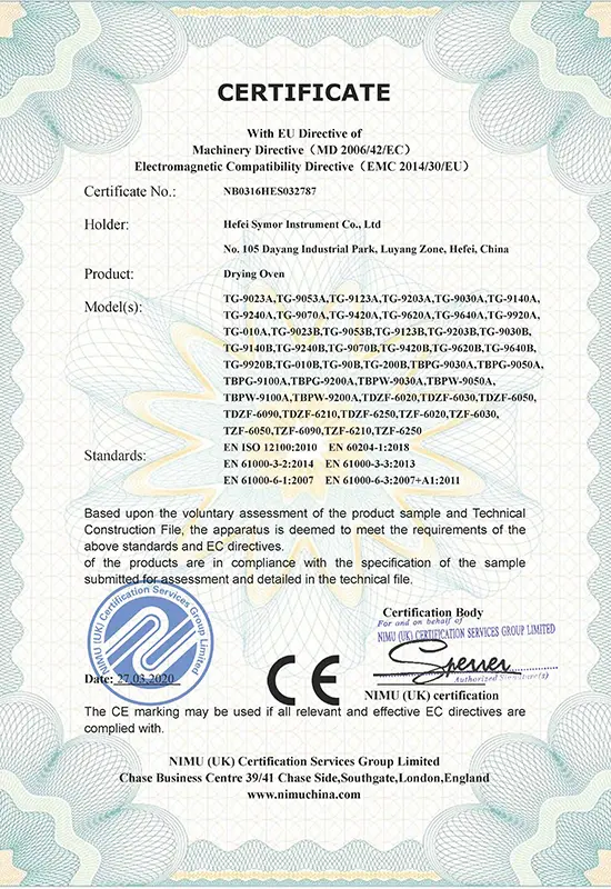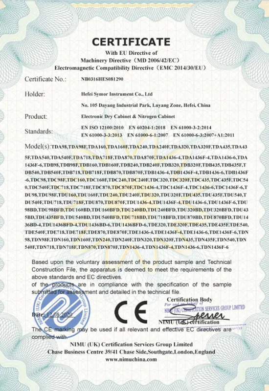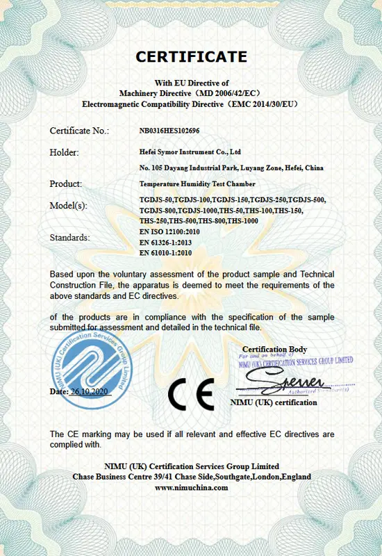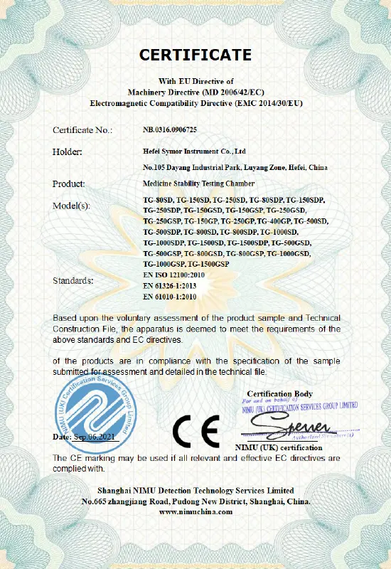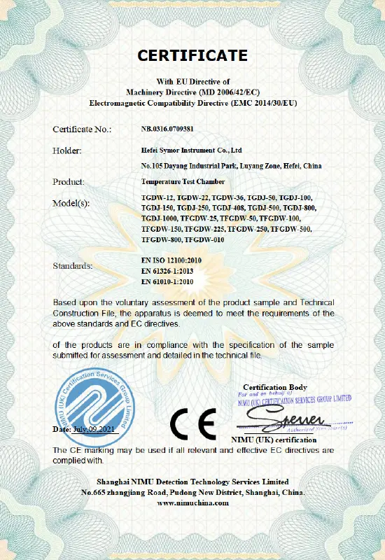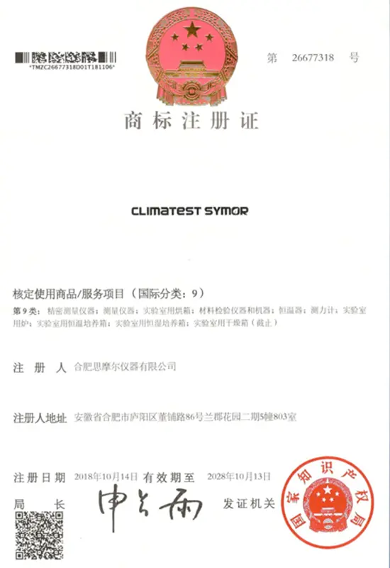 O sucesso empresarial está ligado à qualidade. Impulsionados por um rigoroso sistema de controle de qualidade, estamos comprometidos em fornecer produtos e soluções superiores e nos esforçamos para criar valor agregado para nossa clientela global. Symor Instrument Equipment Co., Ltd é certificada pela ISO 9001:2015, todas as câmaras climáticas e gabinetes secos são aprovados pela CE.