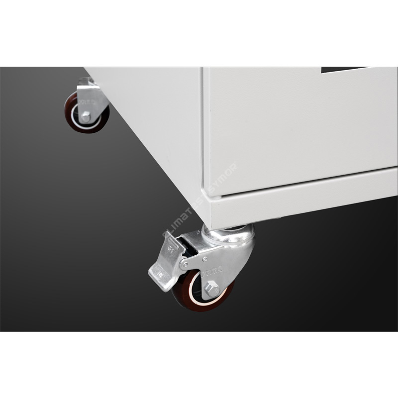 - Rodízios de PU reforçados são instalados na parte inferior do armário de armazenamento seco desumidificador, dois frontais com freios para facilitar o movimento e a parada.